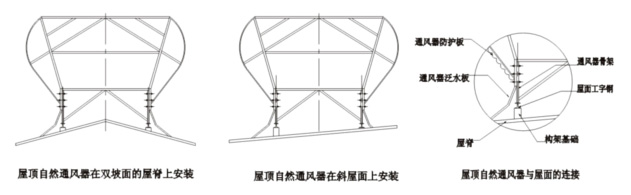 五、屋頂通風器的安裝示圖 屋頂通風器安裝在用戶提供的基礎(chǔ)構(gòu)架上,構(gòu)架面應做成水平。可以單排布置,也可雙排布置,可布置在雙坡屋面的屋脊處,也可布置在斜屋面上。屋頂通風器安裝完畢后,應作防水處理。 ![]()